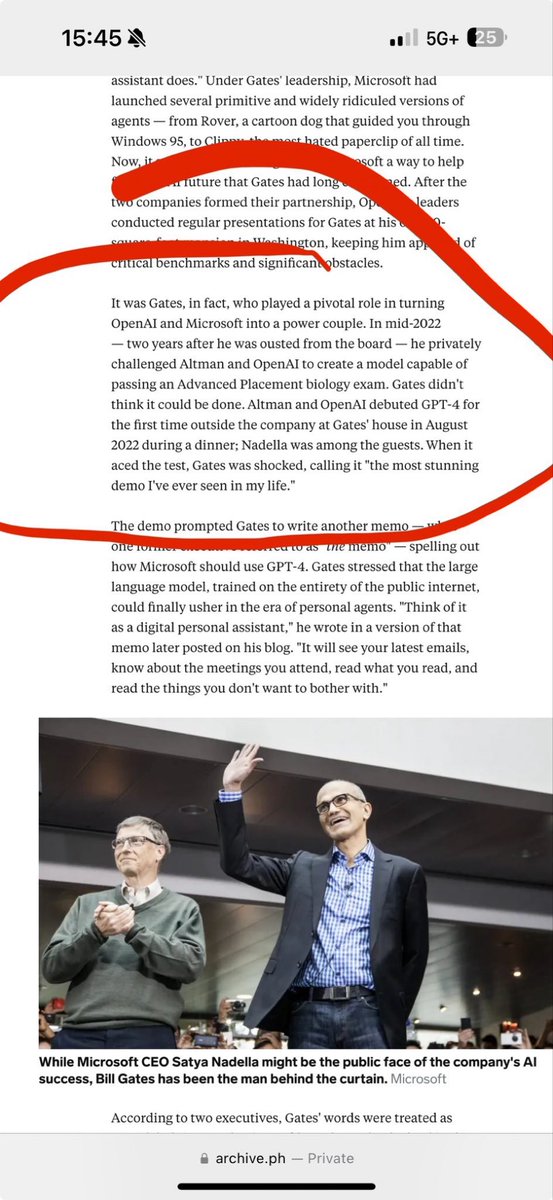 The statement and accompanying images discuss the involvement of Bill Gates in the development and promotion of OpenAI's GPT-4, raising questions about the transparency and accuracy of its performance claims. The tone is inquisitive and somewhat skeptical, aiming to scrutinize the relationship between Gates, OpenAI, and the purported capabilities of GPT-4.