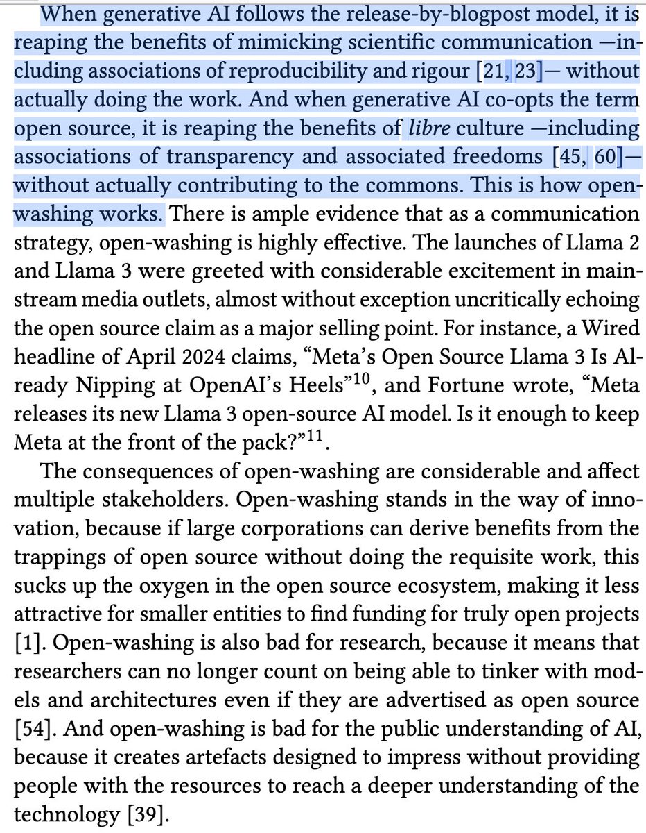 The statement and the accompanying images constitute public discourse as they engage in a substantive discussion about the practices and implications of 'open-washing' in the context of generative AI and open-source models. The conversation critiques how certain AI models and companies may misuse the term 'open source' to gain benefits without adhering to the principles of transparency and contribution to the commons.