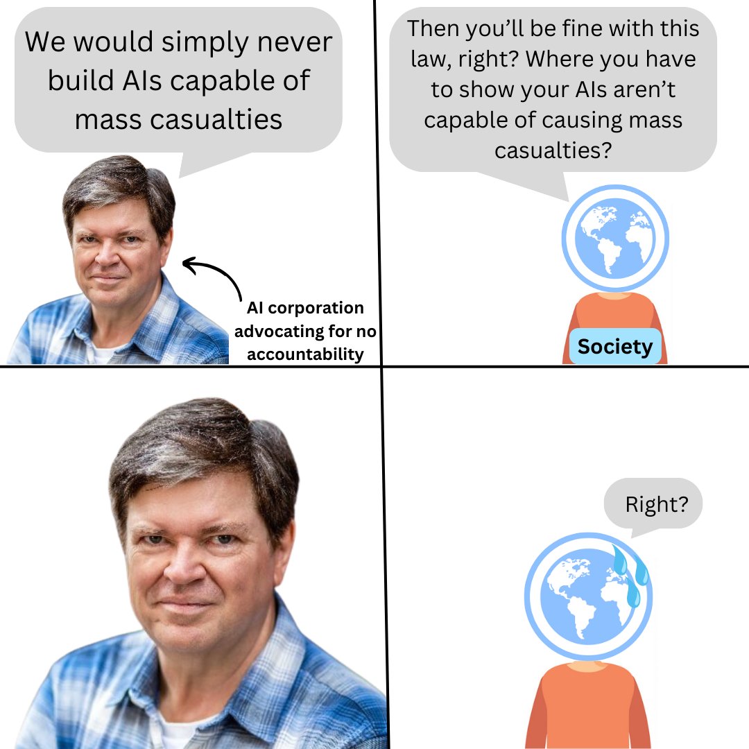 The statement and accompanying images engage in public discourse by addressing the issue of AI safety and corporate accountability. The tone is critical and somewhat sarcastic, aiming to highlight perceived inconsistencies in the stance of AI corporations regarding safety regulations.