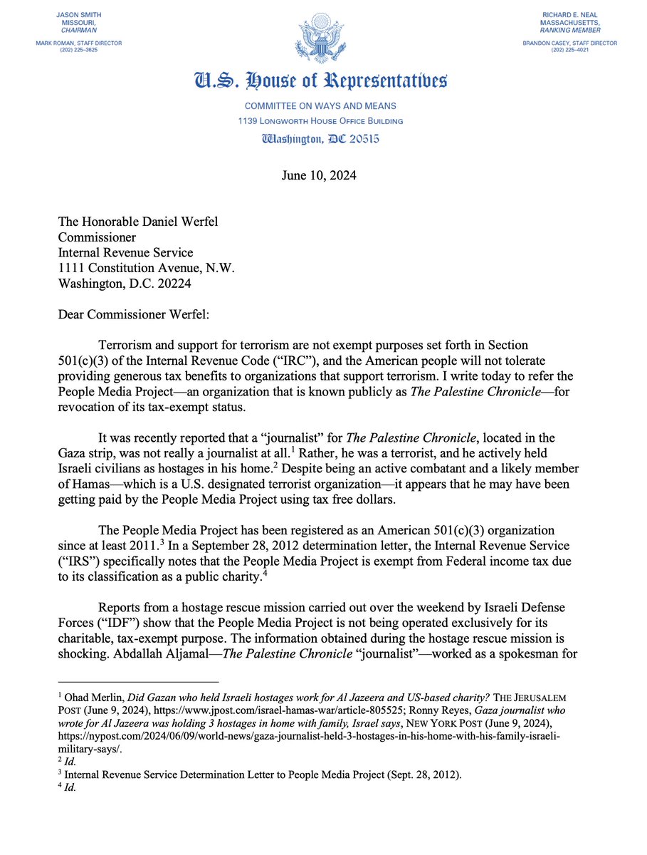 The statement and accompanying images engage in public discourse by addressing the issue of tax-exempt status for organizations allegedly supporting terrorism. The tone is accusatory and calls for immediate action by the IRS. The statement touches on several principles, including the potential for harm, respect for privacy and dignity, and the use of influence for societal betterment.
