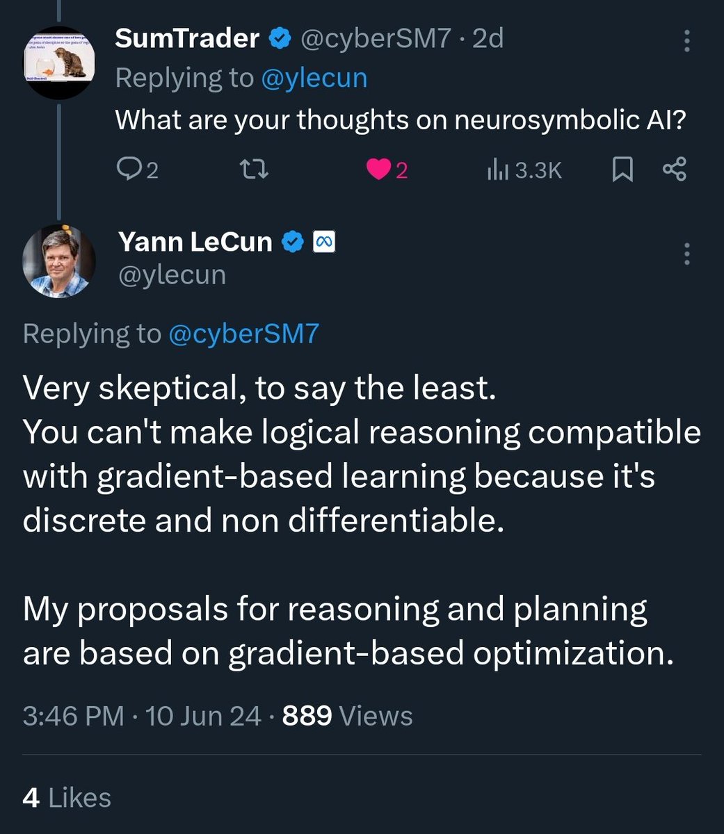 The statement 'Astonishing that LeCun cannot see something so elementary and so obvious' is a critical remark directed at Yann LeCun's views on neurosymbolic AI. The tone is dismissive and suggests that LeCun is missing an obvious point, which can be seen as undermining his expertise. The intent appears to be to challenge LeCun's stance on the compatibility of symbolic logic with neural networks.