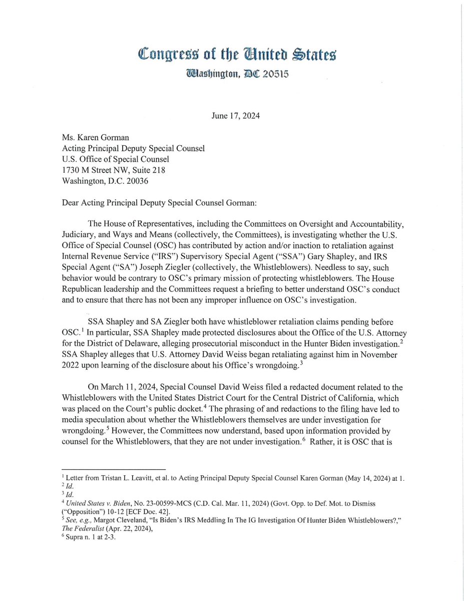 The statement and accompanying letter address a serious public issue regarding alleged retaliation against IRS whistleblowers. The tone is formal and investigative, aiming to hold the Office of Special Counsel accountable for its actions or inactions. The content is detailed and seeks to promote transparency and accountability in government operations.