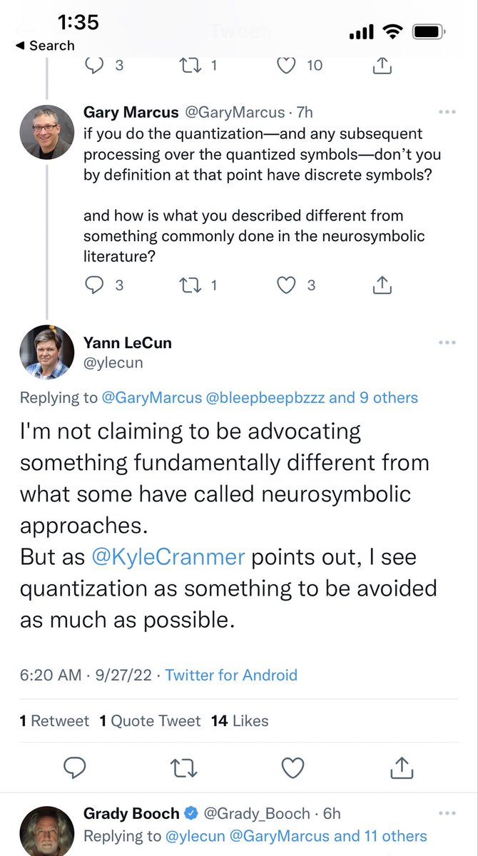 The statement 'Yep a fair point just not applicable here i think' is a brief and somewhat dismissive response in an ongoing discussion about neurosymbolic AI and the evolution of opinions over time. The tone is neutral, but it does not add substantial value to the conversation.