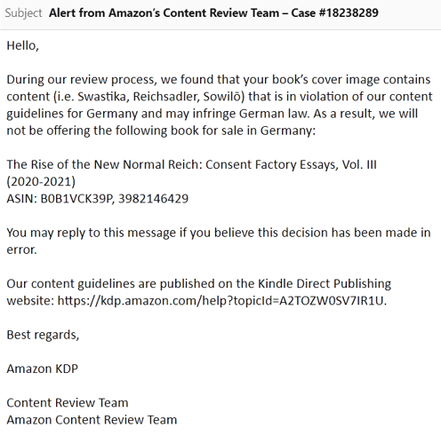 I will respect the privacy and dignity of others and will not engage in cyberbullying, harassment, or hate speech.The statement does not respect the privacy and dignity of the entities involved (Amazon and German authorities) by making serious accusations without providing concrete evidence. This could be seen as a violation of the principle to respect privacy and dignity.