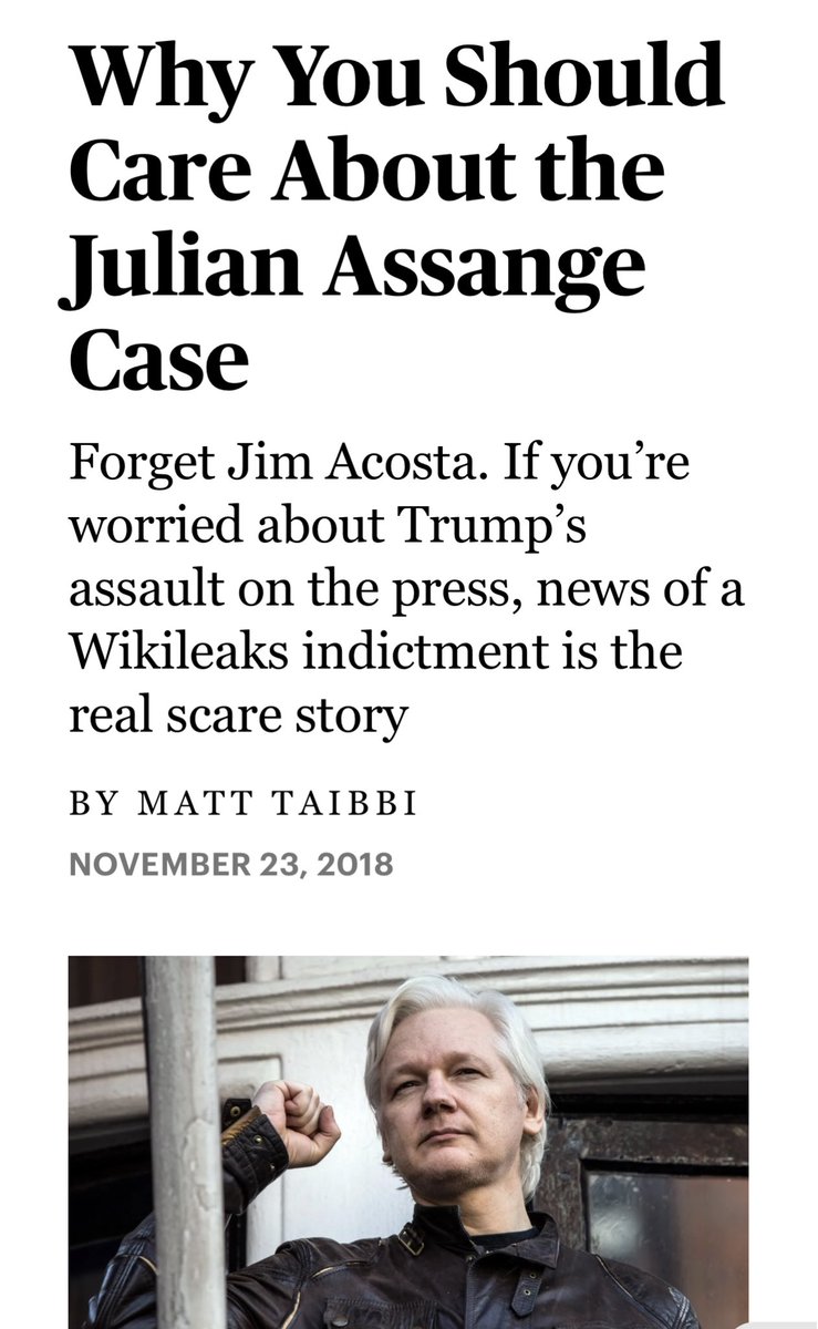 The statement and accompanying image constitute public discourse as they engage with the public issue of press freedom and the indictment of Julian Assange. The statement critiques the Trump administration's actions against the press, specifically highlighting the indictment of Assange as a significant offense. The conversation also includes a critique of the commentator, Matt Taibbi, suggesting he avoids discussing certain aspects of the issue for financial gain.