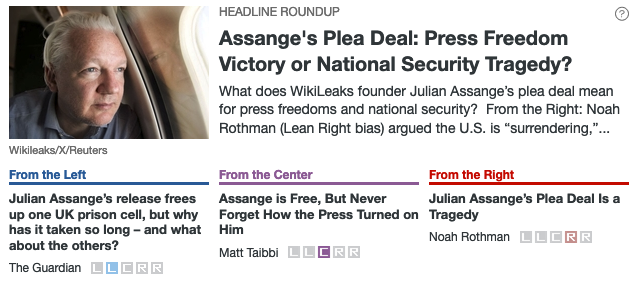 The statement and accompanying image engage in public discourse by addressing the implications of Julian Assange's plea deal on press freedoms and national security. The content aims to present multiple perspectives from different political biases, encouraging a balanced and comprehensive discussion on a significant public issue.
