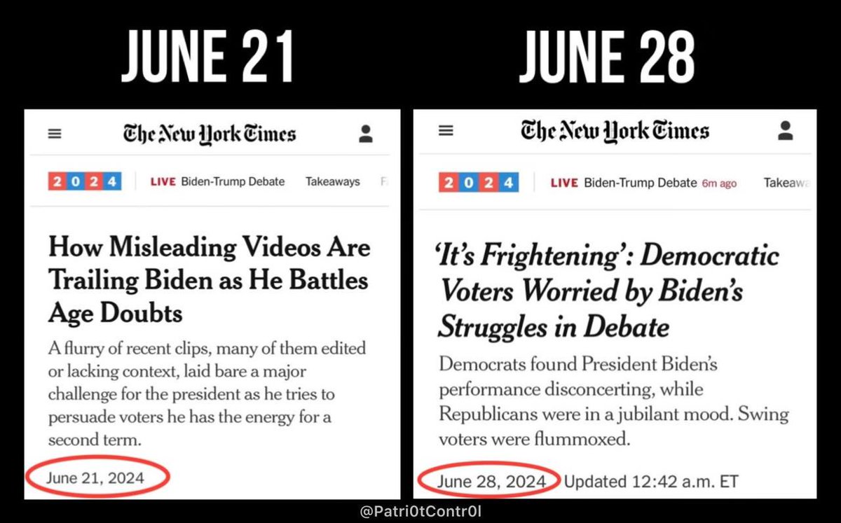 The statement 'Just 7 days.' accompanied by the image of two headlines from The New York Times dated June 21, 2024, and June 28, 2024, appears to highlight a shift in media narrative or public perception regarding a political figure within a short period. The intent seems to be to draw attention to the rapid change in the portrayal of the political figure's performance and public opinion. The tone is critical and aims to provoke thought or discussion about media coverage and political dynamics.