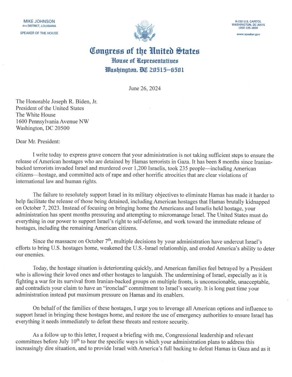 The statement and accompanying letter constitute public discourse as they address a significant public issue: the safety and return of American hostages held by Hamas and the U.S. administration's foreign policy towards Israel. The tone is critical and urgent, aiming to prompt action from the President and his administration.