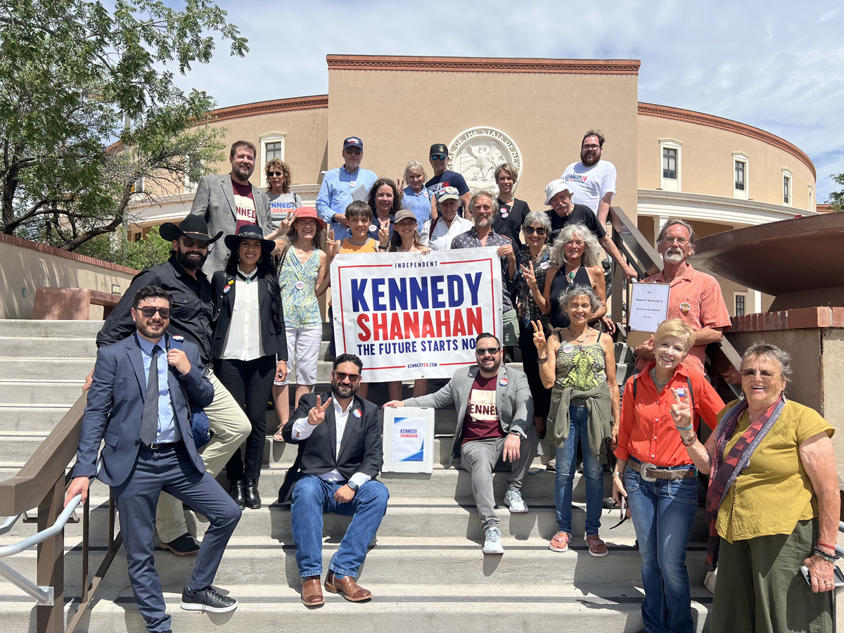 The statement 'Thank you, New Mexico! 🙏🇺🇸' accompanied by an image of a group of people holding a campaign sign and a conversation about a political campaign gaining ballot access in New Mexico constitutes public discourse. The statement and image express gratitude and celebrate a political milestone, which is relevant to civic dialogue and public engagement.
