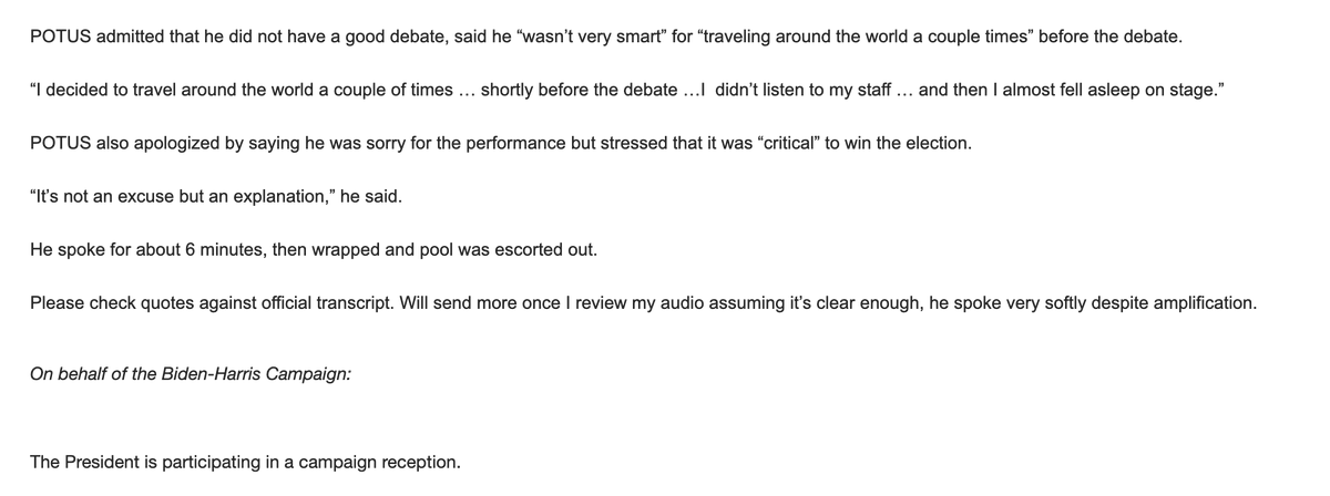 The statement critiques President Biden's explanation for his debate performance, suggesting a contradiction between his campaign's messaging and his personal explanation. The tone is critical and somewhat skeptical, aiming to highlight perceived inconsistencies in Biden's narrative.