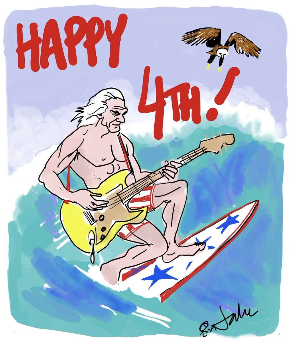 The image is a lighthearted and celebratory illustration for the 4th of July, featuring a person surfing with a guitar and an eagle flying overhead. It does not engage in substantive public issues, debates, or discussions that contribute to civic dialogue.