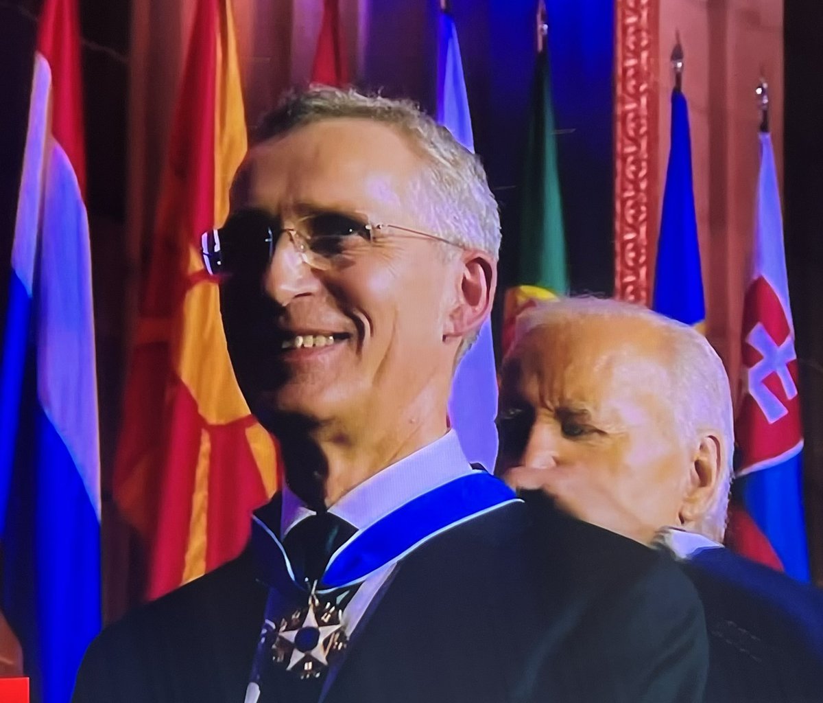 The statement reports on a public event where President Biden awards the Presidential Medal of Freedom to NATO Secretary General Jens Stoltenberg. The tone is neutral and factual, with a slight emphasis on Stoltenberg's emotional reaction. The image supports the statement by showing the moment of the award ceremony.