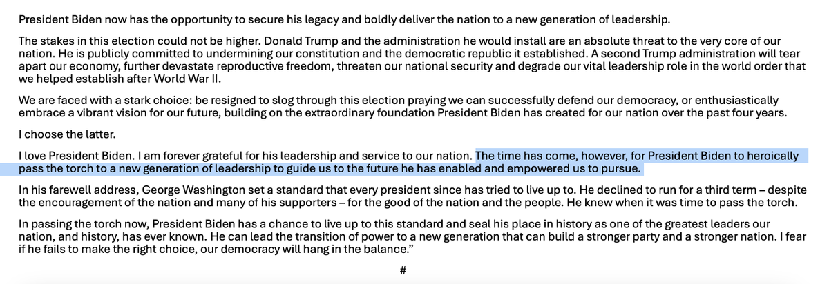 The statement and accompanying image constitute public discourse as they engage with the topic of political leadership and the future direction of the country. The tone is respectful and acknowledges President Biden's contributions while advocating for a transition to new leadership. The intent is to promote a change in leadership for the perceived betterment of the nation.