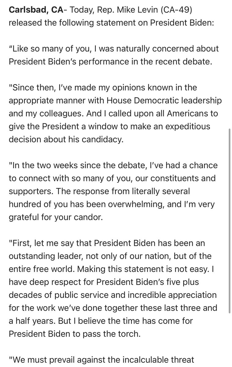 The statement by Rep. Mike Levin constitutes public discourse as it addresses a significant political issue, namely the leadership and future candidacy of President Biden. The tone is respectful and acknowledges President Biden's contributions while expressing a differing opinion on his future candidacy.