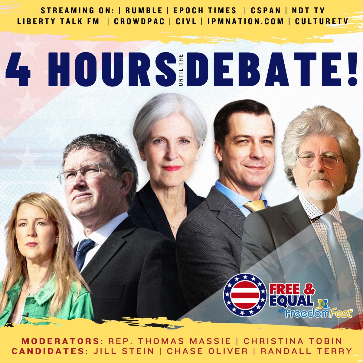 The statement and accompanying image promote an upcoming presidential debate at FreedomFest, emphasizing the diversity of voices and the importance of impactful discussions. The tone is enthusiastic and promotional, aiming to encourage participation and donations.