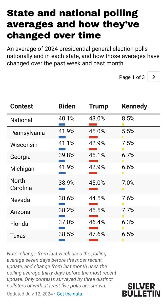 The statement 'presented without comment' along with the image of polling data for the 2024 presidential general election constitutes public discourse as it engages with a public issue, namely the presidential election. The tone is neutral and factual, simply presenting data without any additional commentary or analysis.