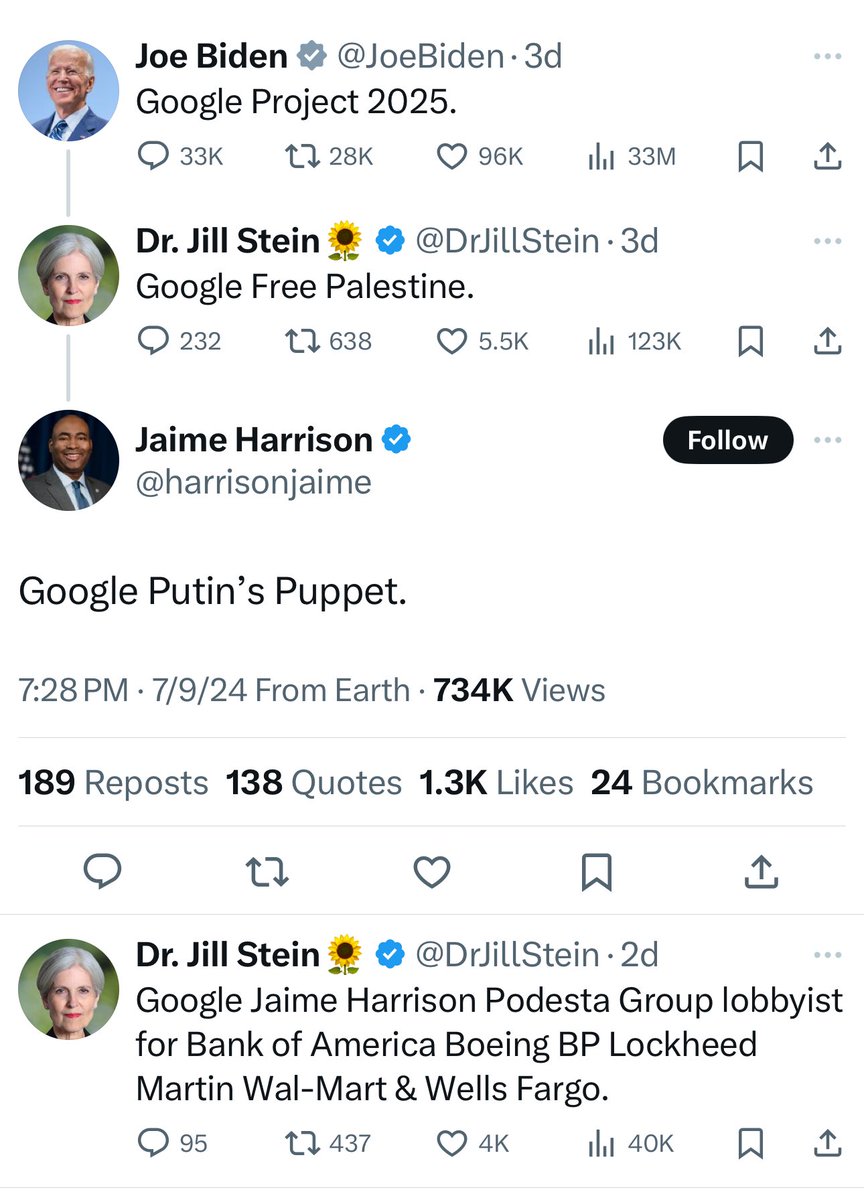 I will use my influence for the betterment of society.The statement uses the author's platform to express a political endorsement, which can be seen as using influence for civic engagement. However, the accusatory nature of the tweets from Jaime Harrison and Dr. Jill Stein may not contribute positively to public discourse.