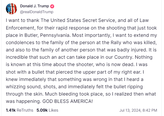 The statement by Donald J. Trump addresses a serious incident involving a shooting at a rally, expressing gratitude to law enforcement, condolences to the victims, and recounting his personal experience of being shot. The tone is serious and empathetic, aiming to inform the public and acknowledge the tragedy.