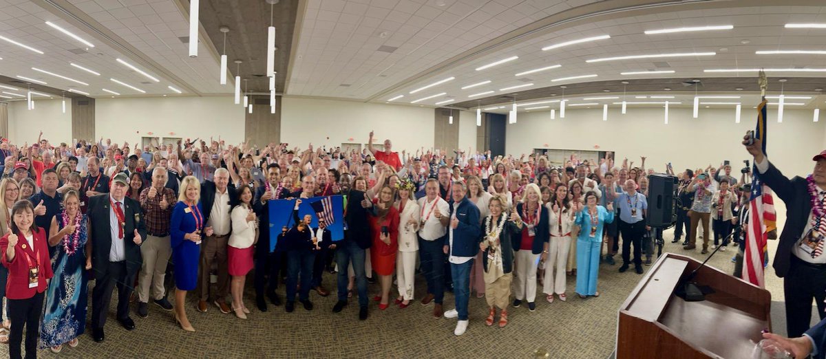 The statement is a supportive message directed towards a public figure, President Trump, from a group of people at an event. It includes a hashtag related to a political convention and a mention of a political figure, Vivek Ramaswamy. The image shows a large group of people, presumably at the event, expressing their support.