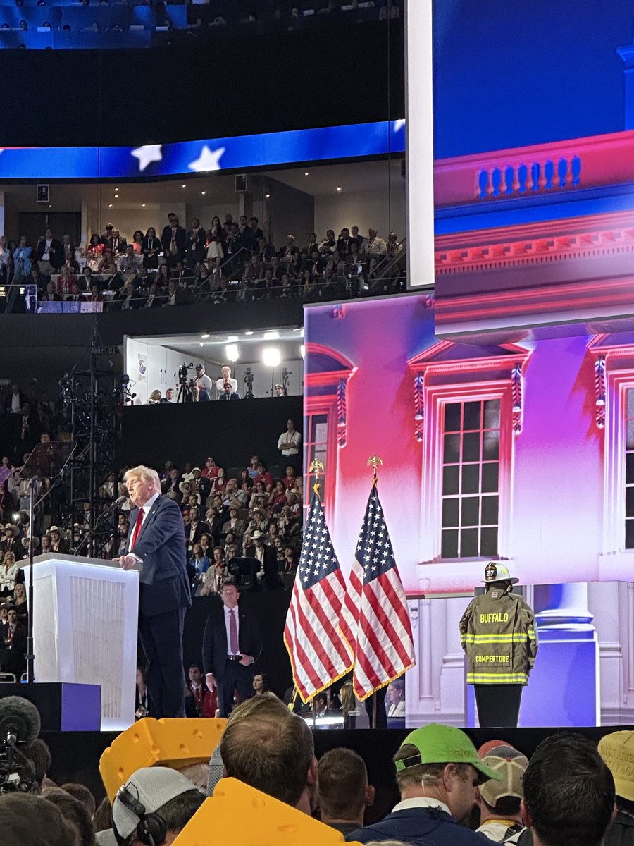 The statement 'COREY! πΊπΈ ππΎ' accompanied by the image of a public figure speaking at a podium with American flags and a firefighter's jacket in the background appears to be a supportive and patriotic expression. The tone is positive and respectful, and the use of emojis suggests a sense of reverence and national pride. The image depicts a public event with a significant audience, indicating that the statement is part of a larger public discourse.