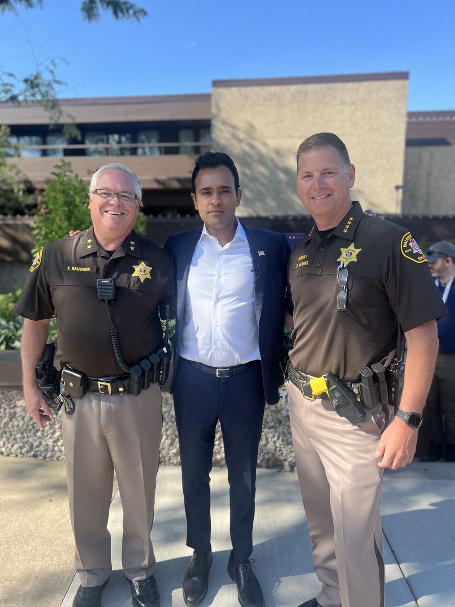 The statement expresses gratitude towards law enforcement officers for ensuring safety in Milwaukee and surrounding cities in Wisconsin. The tone is positive and appreciative, aiming to acknowledge the efforts of law enforcement. The accompanying image shows three individuals, two of whom appear to be law enforcement officers, reinforcing the message of appreciation.
