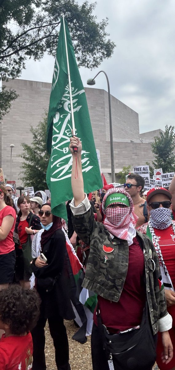 The statement and accompanying images engage in public discourse by addressing a significant and contentious issue related to political protests, terrorism, and public safety. The tone is accusatory and alarmist, suggesting a threat to public order and safety. The statement implies that the presence of the Hamas flag and graffiti are indicative of violent intentions and actions by the protesters.