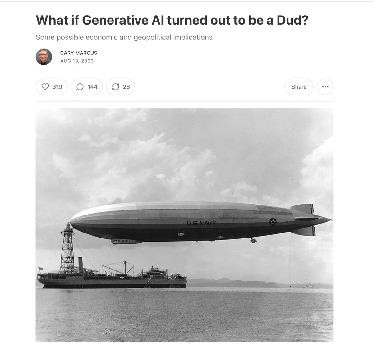 The statement and accompanying image engage in public discourse by addressing the hype and potential overvaluation of generative AI, a significant topic in technology and economics. The tone is speculative and critical, questioning the sustainability and real value of generative AI technologies.