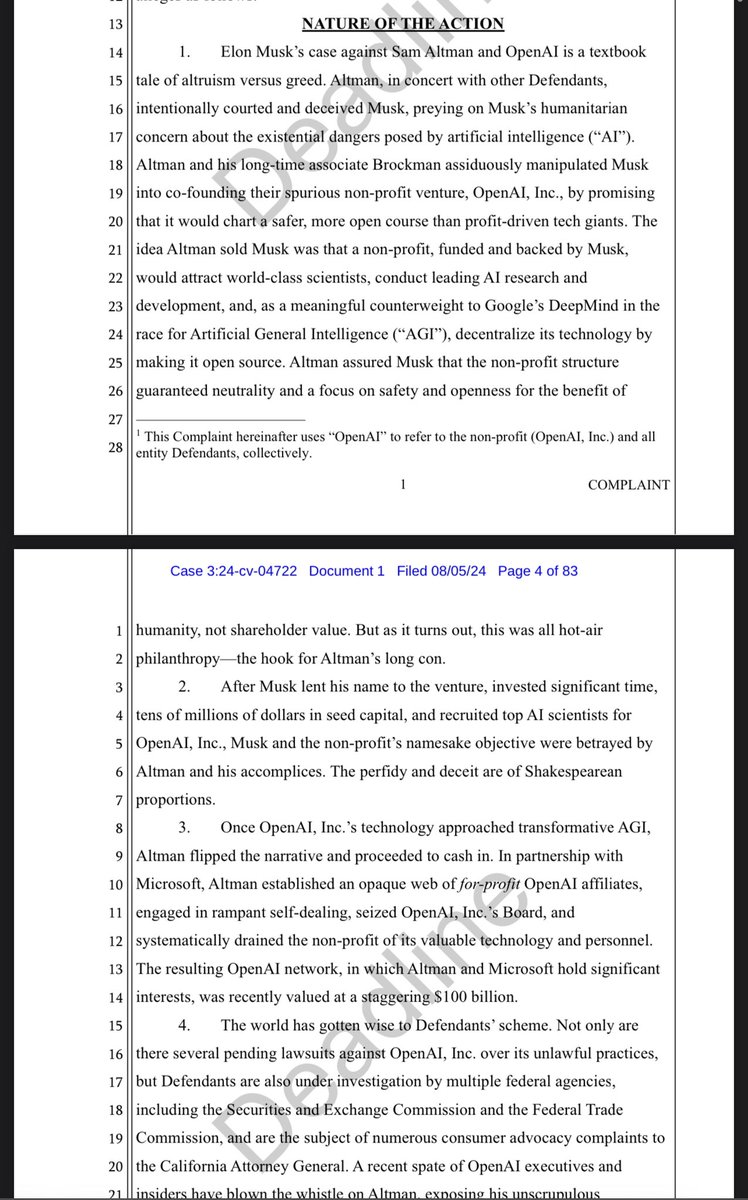 The statement and the accompanying conversation refer to a legal dispute involving Elon Musk, Sam Altman, and OpenAI. The statement 'Ironic and true at the same time?' suggests a critical perspective on the situation described in the legal document, which accuses Altman and others of deceit and manipulation. The tone is somewhat sarcastic and implies a sense of disbelief or criticism towards the actions described in the lawsuit.