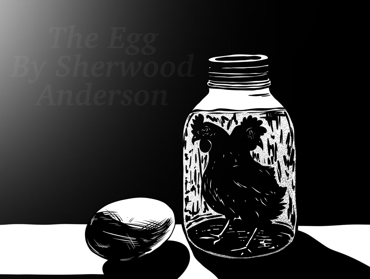 The statement promotes a discussion of a literary work, specifically 'The Egg' by Sherwood Anderson, and includes a link to a related website. The tone is neutral and informative, aiming to engage readers in a literary discussion. The image complements the content by visually representing elements of the story.
