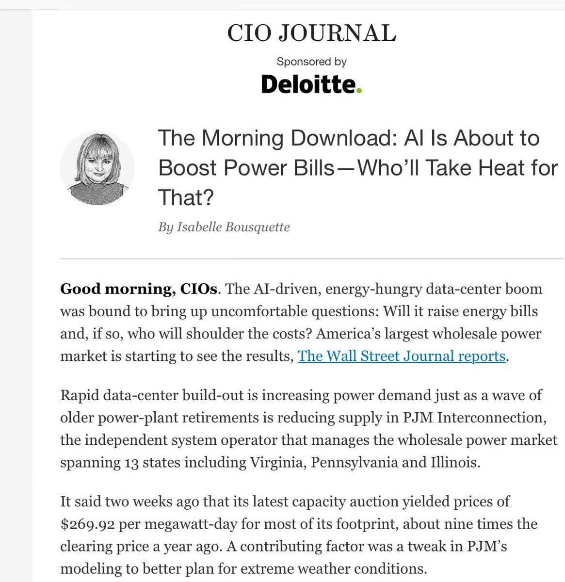 The statement 'Socialize the costs, privatize the gains. The AI Industry’s unofficial motto?' critiques the AI industry's impact on public resources, suggesting that the public bears the costs while private entities reap the benefits. The accompanying image from the CIO Journal discusses the rising power bills due to AI-driven data centers, reinforcing the statement's concern about public costs. The tone is critical and aims to highlight perceived inequities in the distribution of costs and benefits within the AI industry.