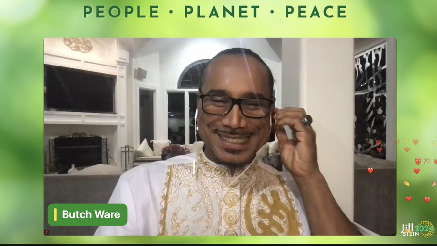 The statement congratulates Dr. Jill Stein's VP Dr. Butch Ware and expresses support for their political ticket, emphasizing a call to resist imperialism. The tone is positive and supportive, aiming to promote a political message.