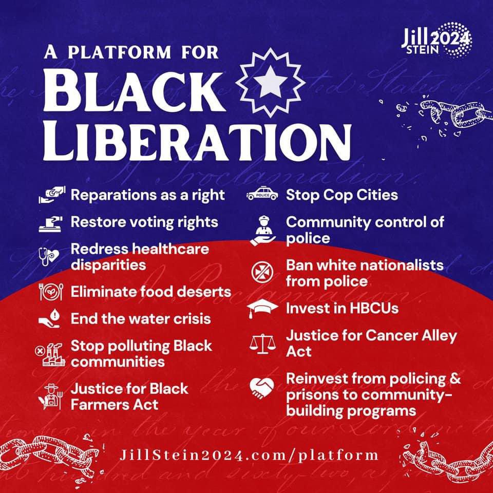 The statement and accompanying image constitute public discourse as they engage with substantive public issues, specifically addressing policies and societal concerns related to racial justice and equity. The tone is informative and promotional, aiming to draw attention to a specific political platform and its detailed proposals for addressing issues faced by Black communities.