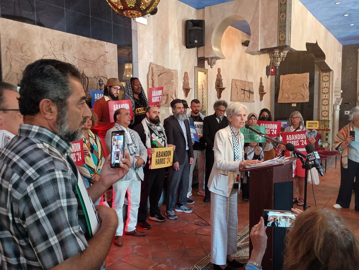 The statement and accompanying image constitute public discourse as they engage with significant political and social issues, including genocide, electoral choices, and anti-war sentiments. The tone is urgent and confrontational, aiming to mobilize action against perceived injustices and political figures.