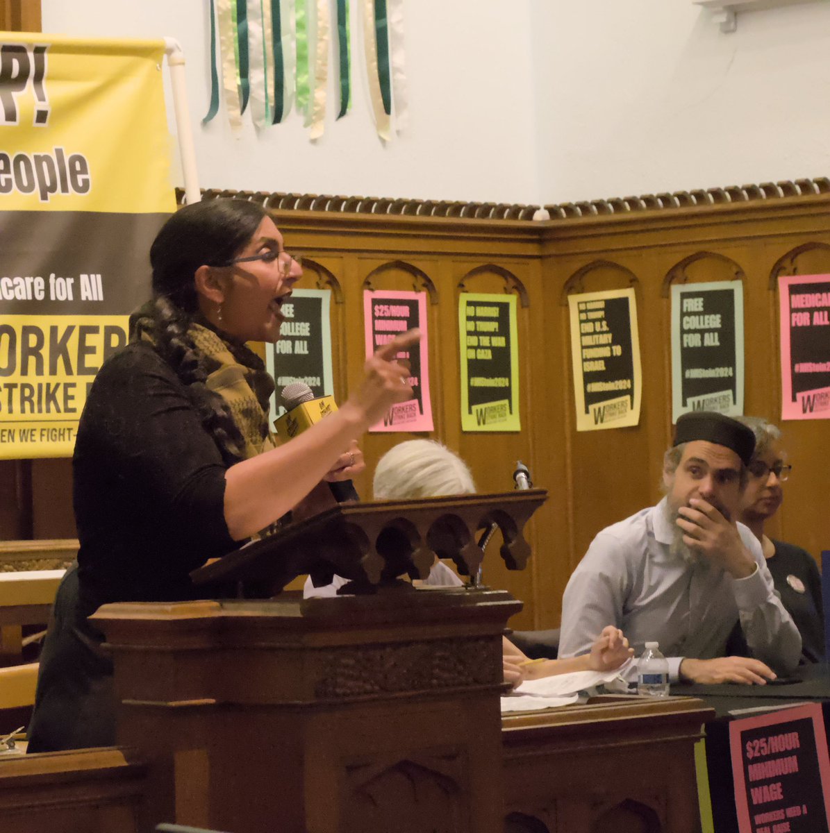 The statement is highly critical of certain political figures and supportive of others, focusing on the issue of U.S. military aid to Israel and the conflict in Gaza. It uses strong language and makes specific accusations against public figures while promoting a political campaign and rally. The tone is confrontational and divisive, aiming to mobilize support for a particular cause and political candidate.