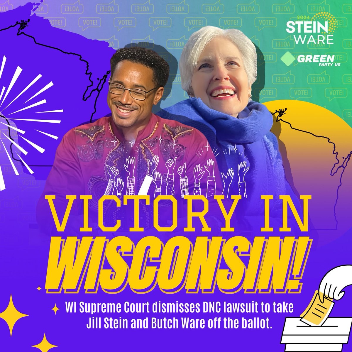 The statement and accompanying image celebrate a legal victory for Jill Stein and Butch Ware, allowing them to remain on the ballot in Wisconsin. The tone is enthusiastic and supportive, encouraging people to vote for these candidates. The statement also includes a call to action to vote for workers and against genocide, which touches on broader societal issues.