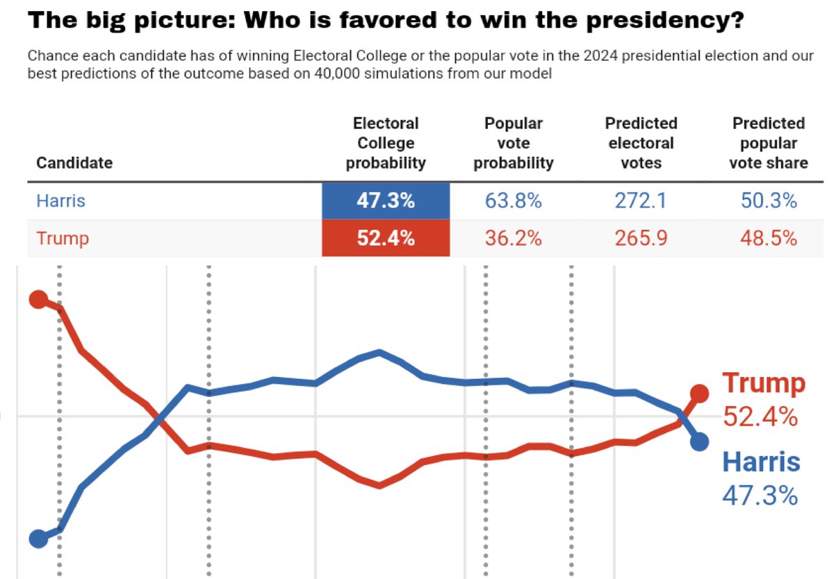 The statement and accompanying images provide a detailed analysis of the latest election forecasts, comparing the chances of winning for two political candidates, Trump and Harris, across various dates and swing states. The content is factual and data-driven, focusing on polling data and probabilities.