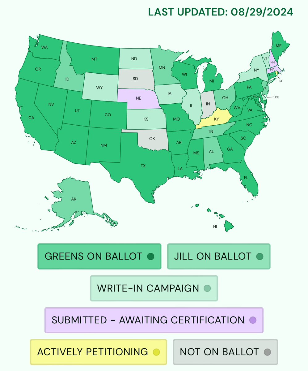 The statement and accompanying image engage in public discourse by addressing the topic of ballot access for a political candidate, which is a substantive issue in the context of elections and democratic processes. The tone is assertive, aiming to correct a perceived misinformation about the candidate's ballot status. The intent is to inform and possibly mobilize support for the candidate by clarifying her eligibility in various states.