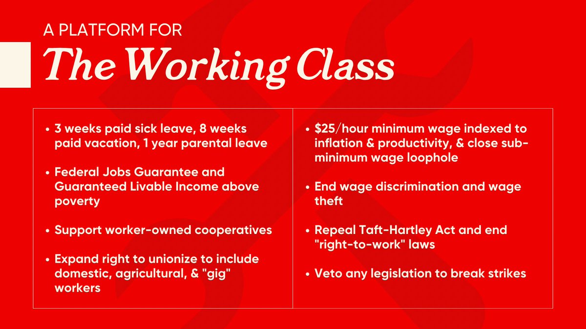 The statement and accompanying image constitute public discourse as they address significant societal issues related to labor rights, wages, and economic inequality. The tone is assertive and advocates for systemic changes to improve the conditions of working people. The content includes specific policy proposals aimed at enhancing workers' rights and economic security.