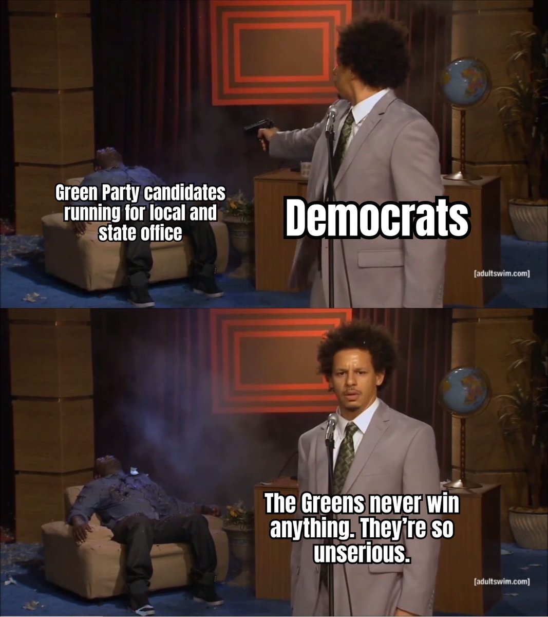 The statement and accompanying image engage in public discourse by addressing the perceived legitimacy and effectiveness of the Green Party in the political landscape. The tone is dismissive and mocking, using humor and sarcasm to convey the message that the Green Party is not a serious contender in elections. The image further emphasizes this point by depicting a scene where the Democrats are metaphorically 'shooting down' Green Party candidates, suggesting that the Green Party's lack of success is due to actions by the Democrats.