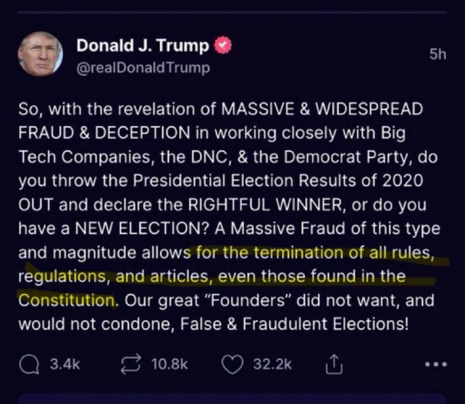 The statement and the conversation it refers to engage in public discourse by discussing a significant political issue: a claim made by a former president about suspending the US Constitution. The tone of the statement is sarcastic and dismissive, suggesting that the individual in question has not changed or matured since the original post. The intent appears to be to criticize and mock the former president's statement.