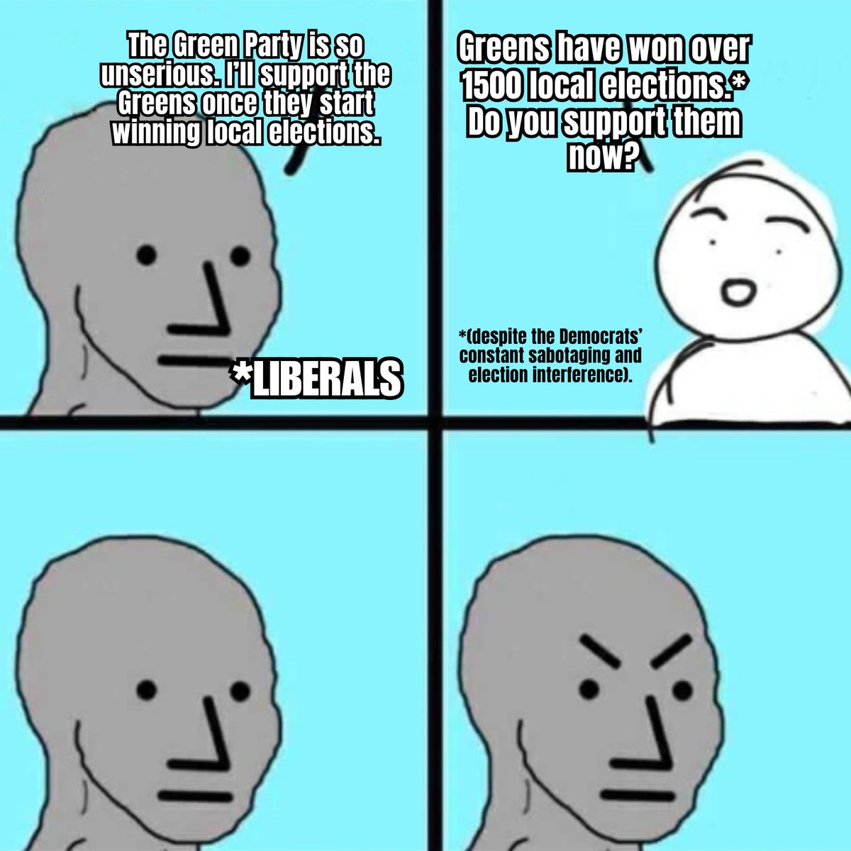 The statement and accompanying image engage in public discourse by addressing the success of the Green Party in local elections and criticizing the Democratic Party. The tone is confrontational and dismissive, particularly with the use of the word 'cope' and the depiction of 'LIBERALS' in a negative light.