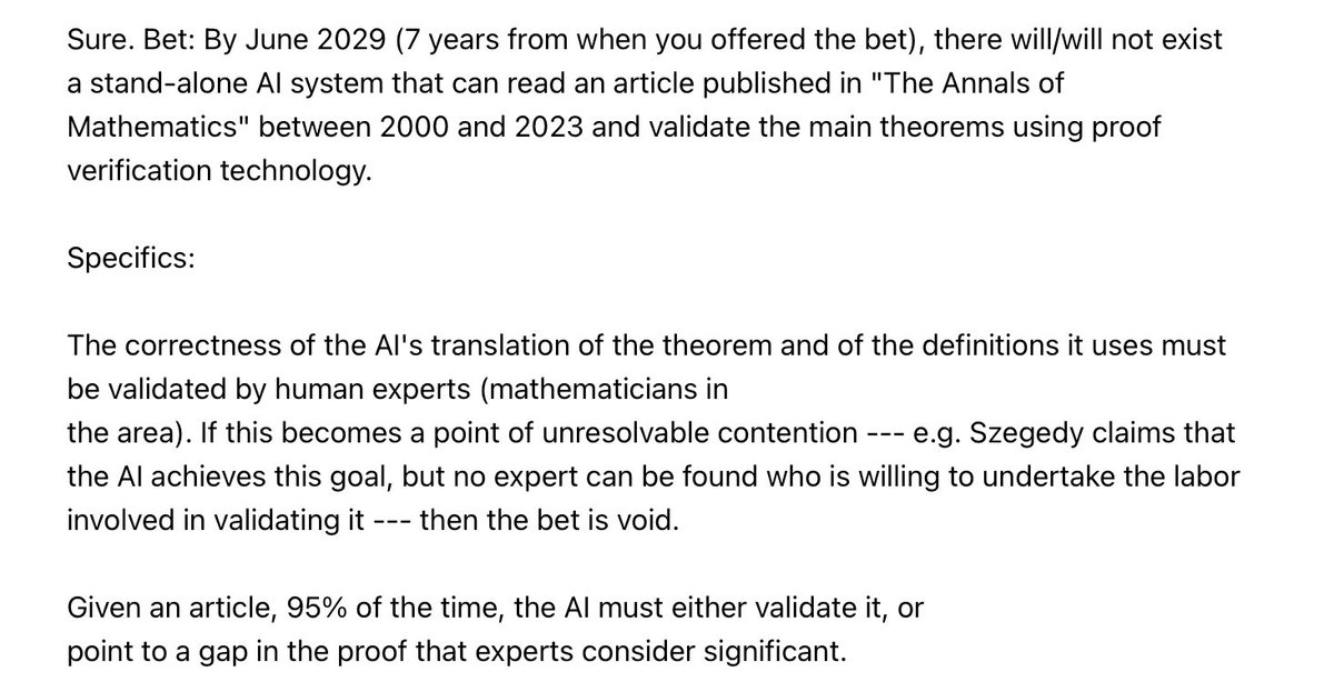 The statement and the preceding conversation constitute public discourse as they engage in a substantive discussion about the capabilities of AI in theorem proving, a topic of public interest in the fields of mathematics and artificial intelligence. The conversation involves multiple participants and references a specific bet about the future capabilities of AI, which has implications for the broader discourse on AI's role in academic and scientific research.