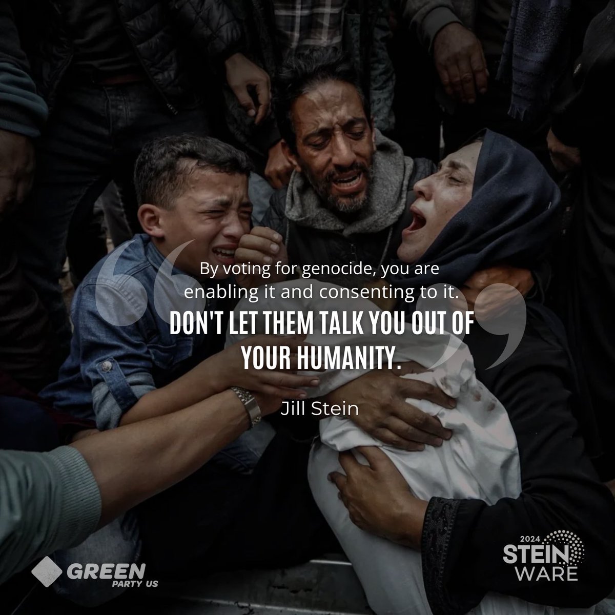 The statement and accompanying image constitute public discourse as they engage with significant societal issues, including political choices, war, and economic policies. The tone is urgent and accusatory, aiming to persuade voters to support a specific candidate by framing the choice as a moral imperative against genocide and other evils.