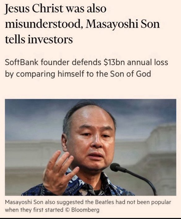 The statement and accompanying images engage in public discourse by addressing the actions and statements of a prominent business figure, Masayoshi Son, and their implications for public perception and investor confidence. The tone is critical and somewhat sarcastic, questioning the appropriateness of Son's comparisons and claims.