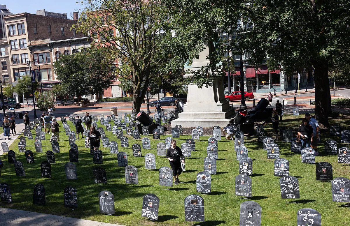 The statement and accompanying image address a significant public issue: the role of pharmaceutical companies in the opioid crisis. The tone is critical and accusatory, suggesting that big pharma has engaged in unethical behavior for profit. The image of a graveyard with numerous tombstones likely symbolizes the lives lost due to the opioid epidemic, reinforcing the gravity of the issue.