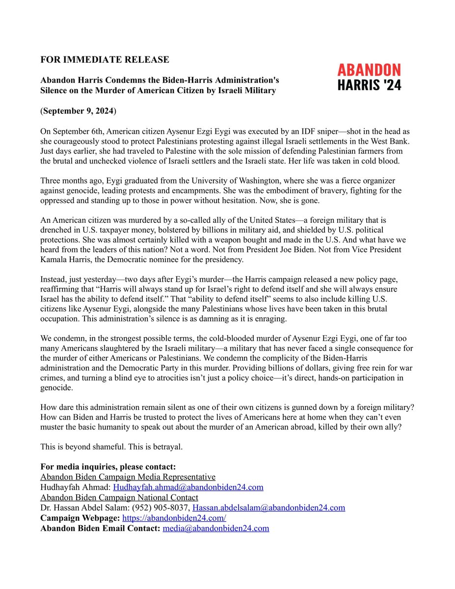 The statement and accompanying image constitute public discourse as they address a significant public issue: the alleged murder of an American citizen by a foreign military and the response (or lack thereof) by the current administration. The tone is accusatory and impassioned, aiming to criticize the Biden-Harris administration for their perceived inaction and complicity.