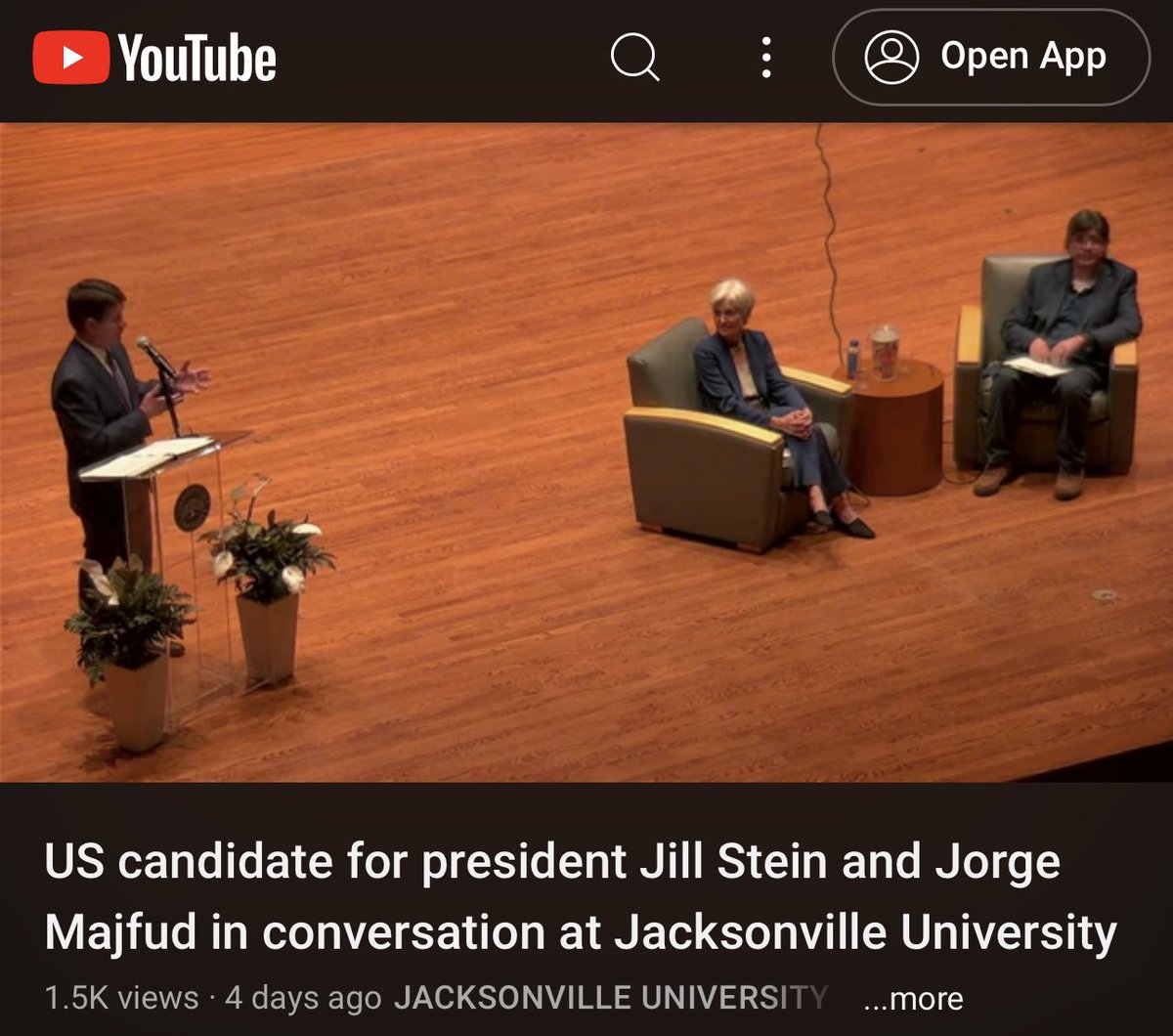 The statement and accompanying image pertain to a public event involving a discussion between two individuals at Jacksonville University. The statement appears to criticize a political group (referred to as 'clown car Dems') and suggests that there is misinformation or negative rhetoric being spread about one of the speakers, Jill Stein. The tone is somewhat confrontational and dismissive towards the mentioned political group.