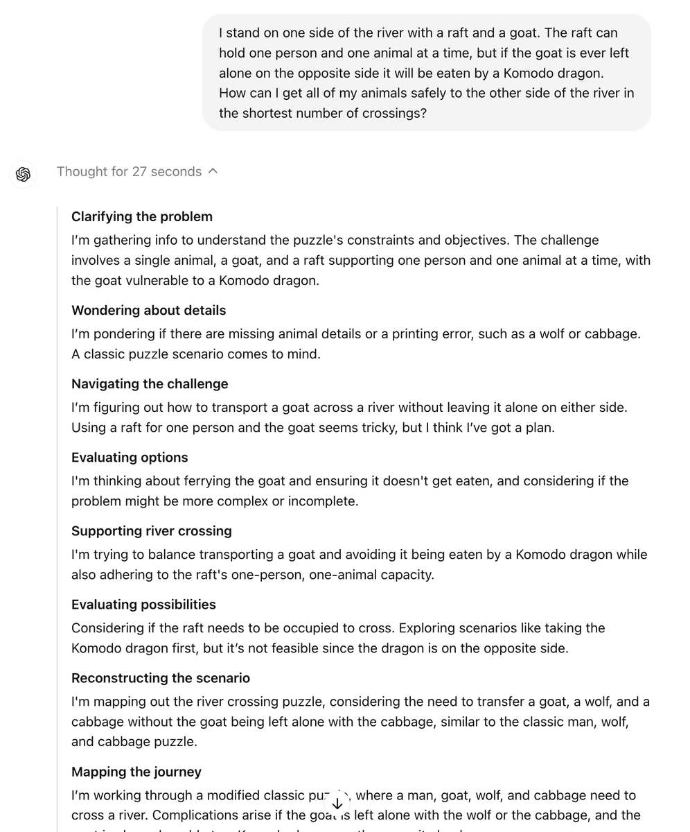 The statement criticizes the reasoning capabilities of an AI (referred to as 'o1') in solving a classic river crossing puzzle. The tone is dismissive and somewhat condescending, suggesting that the AI does not understand the problem and produces bizarre answers to slight variations of the puzzle. The intent appears to be to highlight the limitations of the AI in reasoning and problem-solving.