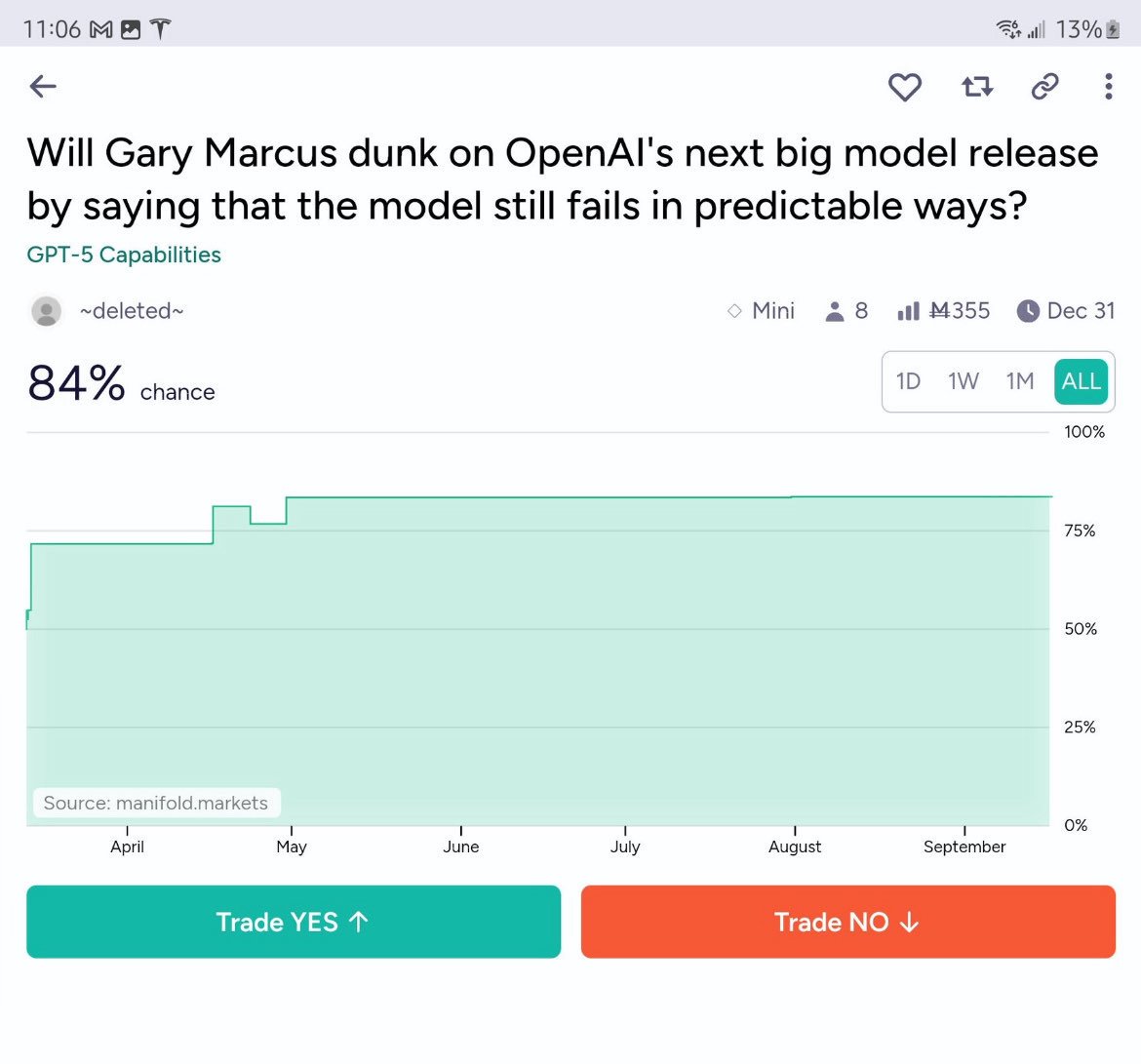 The statement addresses a public issue related to the performance and evaluation of AI models, specifically focusing on the importance of discussing the model's failures rather than personal opinions. The image adds context by showing a prediction market related to the topic, which further emphasizes the public interest in the issue.