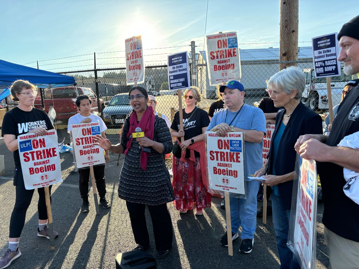 The statement and accompanying images express solidarity with Boeing workers on strike, criticizing corporate exploitation and calling for unity among working people. The tone is supportive and activist, aiming to rally support for the workers' cause.